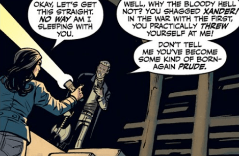 Spike is annoyed. “Well, why the bloody Hell not? You slept with Xander! And you’ve thrown yourself at me before! Don’t tell me you’ve become some born again prude?”