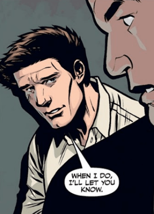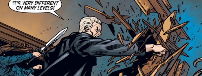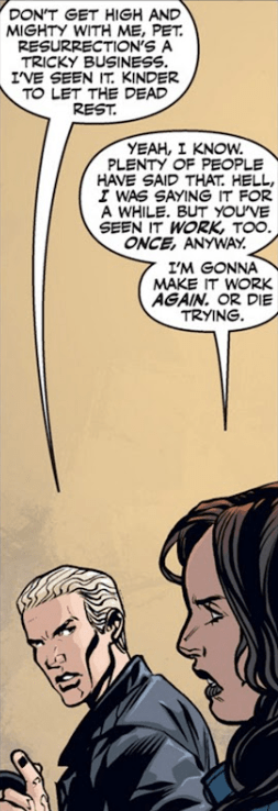 Spike is the first to break it, asking Alasdair if he has something that can regenerate Giles’s body. Alasdair nods. “The Crown of Coils, yes. Angel and Faith brought it back from Peru.” Spike doesn’t look back at him. “Take care of it. Ain’t right, leaving him like that., regardless of what happens. But first write down where we need to find the Enders.”