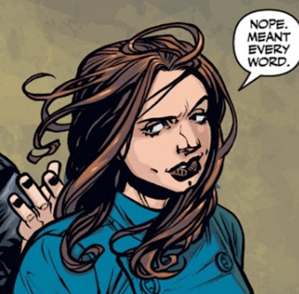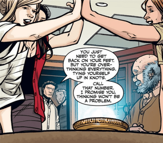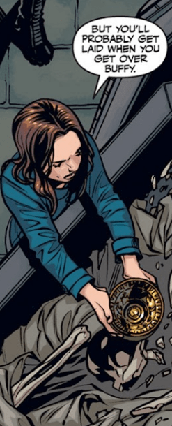 Faith sighs. “All right. I was just putting it out there saying what you lot were thinking.” Off their looks, she quickly adds, “I wasn’t thinking it.” She points at her chest. “I’m gonna find these Enders and I’m going to kill them. I’m going to get this McGuffin and use it to save Angel and Giles. Anyone who wants to help speak up. Anyone who doesn’t, screw you.”