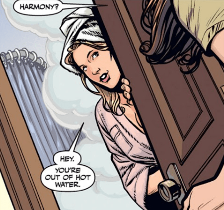 “Hey. You’re out of hot water.” The blonde smiles. Faith is angry about her robe, so Harmony, with no qualms, removes it and hands it to her. Faith looks away, while Angel covers his eyes. It’s then that Spike emerges from the shower, draping a towel around himself. He says good morning, and thanks Angel for Harmony’s number.