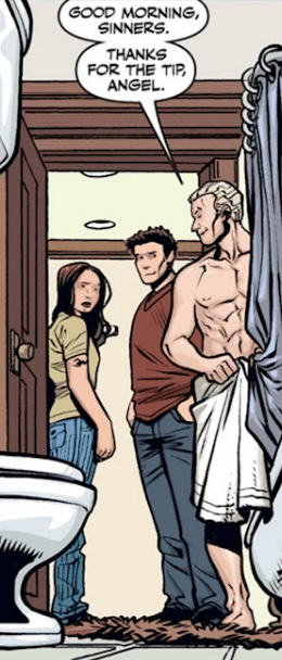 Approaching her bathroom door, Faith is annoyed to find it in use, considering it’s hers. Angel points out that the Sisters are downstairs, in they’re own bathroom, which Faith insists is also hers technically.