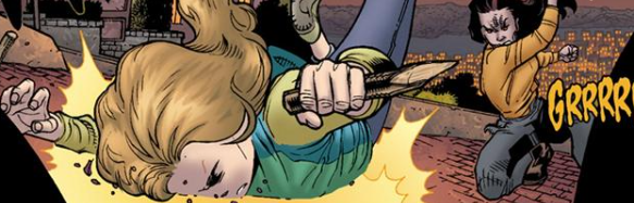 Buffy turns herself over, flipping herself so she’s facing the zompire on the ground. The creature is slowly clawing it’s way up her leg. “Don’t you know it’s sometimes best to just let go?” she mouths, moving her stake into position, but the zompire dislodges it from her grip and she drops the weapon in surprise.
