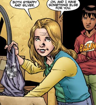 Buffy looks at one of the already open boxes and picks up a strappy, silver top that’s in plain view on the bed. She holds it up at Anaheed. “Both strappy and silver. Oh, and I have something else for you,” she says, Billy looking annoyed at Anaheed behind her.