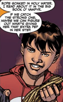 Billy explains that he has rope, soaked in holy water, which he read about in Giles’s book. “If we can catch one, maybe we can figure out what’s giving her that extra pep in her step.”