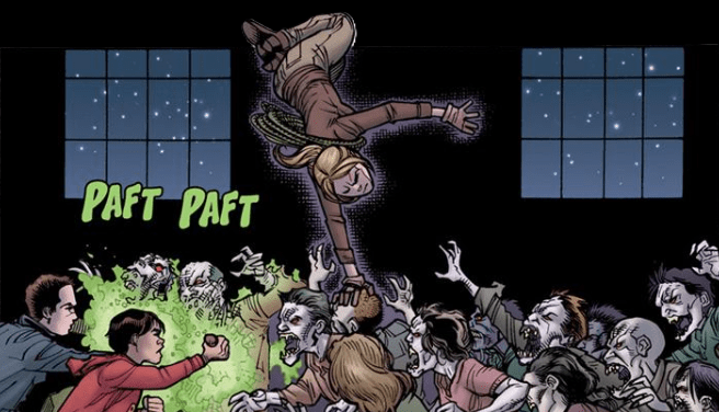 Buffy doesn’t speak or think. She just moves. She flies through the air gracefully, never once doubting with conviction that she’ll land right. She jumps above the crowd, lands on one zompire’s head with her hand and bounces herself up again, propelling herself over the horde like a stage jumper at a rock concert, propelled by the thrashing masses along.