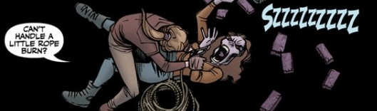 She punches the zompire back as it charges her mindlessly. She ties the rope around the female zompire’s wrists, asking it if she can handle a little rope burn. The creatures wrists begin to sizzle at the rope’s touch and Buffy pulls the zompire closer, letting it snarl inches from her face.