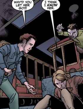 The building is quiet in the setting sun, it’s red brick walls shining in the dim light. Out of an alley way behind them comes Billy, carrying a bag and out of breath. “You Slayers must have super-strength just so you can haul all your gear around,” he pants, catching up with Buffy. She looks over her shoulder at him and asks him what’s in the bag.