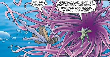 In front of us, there’s what appears to be a large underwater plant of some kind, big and purple, with tendrils coming off it. Like one of the squishy things you find in fish tanks. I can hear voices inside, but there’s no inside to be! The guide tells me that only Aluwyn knows of this and she insists that I touch it.