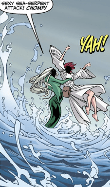 Suddenly, I’m grabbed from behind by something strong, a grip around my waist. ‘Giant flying octopi!’ briefly goes through my mind, but then I hear that husky, hissing tone. She calls it a “sexy sea-serpent attack” – but quite frankly, Aluwyn scared the crap out of me! And turned all of my mermaid fantasies into shark movies!