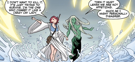 As light sparks out of both our hands, I tell Aluwyn I don’t want to kill the creature – after all, I was the one going all crazy-cat lady with it’s little selves, so Aluwyn suggests that, despite my appearance, we try to make us less appetizing to Mr. Sea Monster.