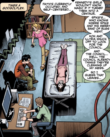 “Faith’s currently occupied. And self-centred… Kennedy’s girls wouldn’t know magic if it turned them into a centaur. Spike’s…. who knows where Spike and his merry band of bugs went. Koh and Illyria snuck off to look for the Council… and the Council… well, they already think I’m cleaning up their mess!”
