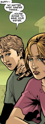 “Alone? Not the first time I’ve heard that.” He walks over to her, places his hand on her shoulder, reassuringly. “Buffy, no matter what Xander thinks, you’re going to save your sister.”