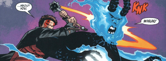 Angel slams the mace straight into the back of Whistler’s head and he reacts in shock, fumbling forward, but still holding the orb. As Whistler turns, Angel strikes again, swinging, this time Whistler avoiding the weapon. “Losing magic threw off your balance.” The orb falls from the demon’s hands, finally, and it rolls around the floor, clattering loudly. Angel drops the mace and propels himself over his enemy.