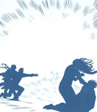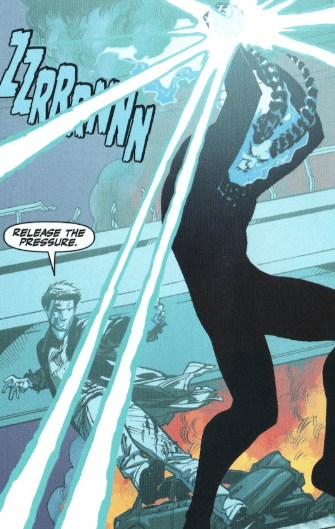 Angel, still on the floor, reaches out to his mentor in desperation, but it’s too late. An almighty burst of light bursts from Whistler’s form, blinding everybody and showering them in blue cascading energy. It blows out from the demon, like a shockwave.