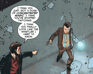 Angel smiles however, and points at his former mentor’s human form. “I think you just got a dose of concentrated magic. I think you’ve stopped twitching. I think you finally look like the Whistler I used to know.”