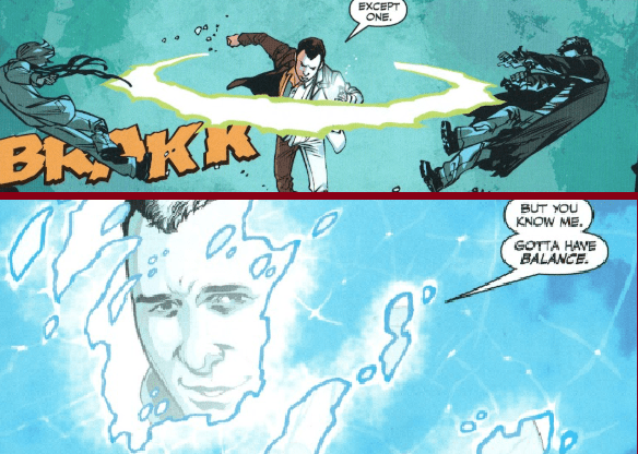 Angel wastes no time. He grabs Whistler by his jacket lapel and drags him forward towards the people. Some are on the ground unconscious, others are reeling with strange magical properties springing to life from their torsos. “Look around. Now that the hunger for magic isn’t eating at you. It bothered you before, but your own need was stronger. Now that you got a fix, now that your balance is restored, ask yourself: is this the world you want to create?”