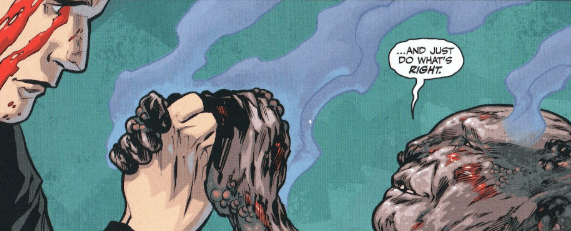 “You already done it kid. Saved me from myself. And those two billion people. That was nice too.” He coughs, his lungs struggling to provide him with the air he needs. His face is unrecognisable and his eyes are swollen shut. His hair is gone.