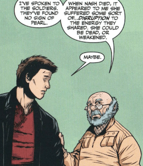 As the nurse looks on, still horrified, Alasdair approaches Angel, looking concerned. “Angel? I’ve spoken to the soldiers. They’ve found no sign of Pearl. When Nash died, it appeared to me she suffered some sort of disruption to the energy they shared. She could be dead, or weakened.”