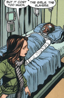 Faith races to the Slayer’s side, cradling her in her arms and helping her sit up. “Stay with me. Hey, you did it girl. You avenged your sisters.”