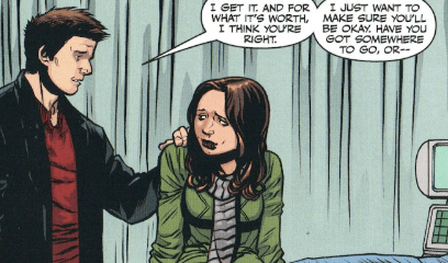 Angel sits next to her, puts his hand on her shoulder. He smiles. “I get it. And for what it’s worth, I think you’re right. I just want to make sure you’ll be okay. Have you got somewhere to go, or…”
