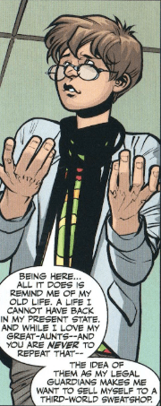 The former Watcher gets up from his seat and gestures to his side. “Being here, all it does is remind me of my old life. A life I cannot have back in my present state. And while I love my great-aunts – and you’re never to repeat that – the idea of them as my legal guardians makes me want to sell myself to a third-world sweatshop.”