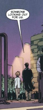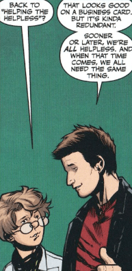 “That looks good on a business card, but it’s kinda redundant. Sooner or later, we’re all helpless. And when that time comes, we all need the same thing.” They both exit the tent and walk into the night, heading for the crowd. Angel smiles.