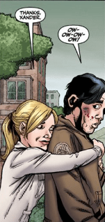 “Oh God,” whispers Buffy, turning Xander around and staring at his face. It’s covered in bruises, his remaining eye swollen. He also has a broken nose. Her eyes spark with anger. “Who gave you everything else?”