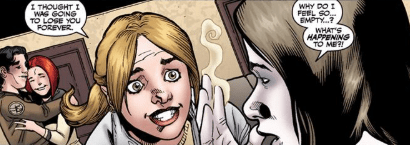Then he falls to the ground, in obvious pain. Buffy rushes to his side. “Who? What? Did Willow..?”