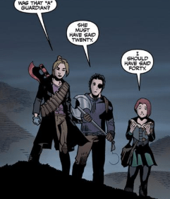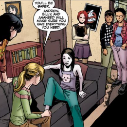Before she can ask him anymore, Buffy calls them over. Kennedy has a plane waiting: it’s time to go. As they leave, Andrew, Anaheed and Billy settle in, watching Dawn as she moves back to lying on the sofa. Then they hear a thud.
