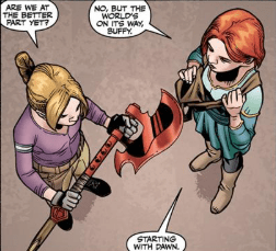 Buffy picks up the Scythe. She looks down at it. It’s been a while. She turns to Willow. “Are we at the better part yet?”