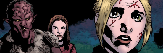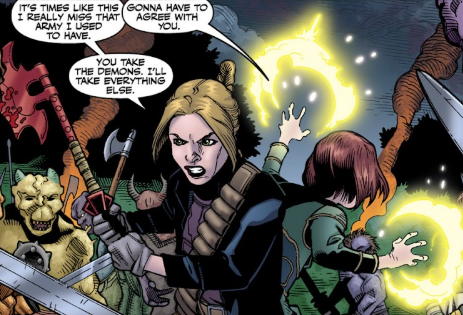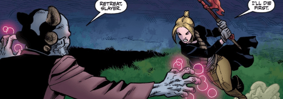 Buffy looks at the blade in the creature’s flesh as it’s wielder pulls it free with the same strange noise. It’s Eldre Koh and he’s flanked by the powerless Illyria. Buffy is surprised to see them. The Merciless Old One, although depowered and looking human, still speaks with authority. “D’Hoffryn put out word that the Cotswalds passage was under attack.”