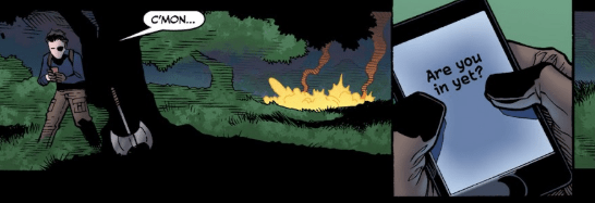 Xander watches from a distance, out of sight of his friends and their adversaries. His phone beeps and he looks down an a received message from Simone. It says that she and Severin need more time. Xander scoffs and looks up at the din of the battle site, fire and energy blasting. The sounds of war fill the night. He whispers back to Simone in the dark. “I don’t think you’re gonna get it.”