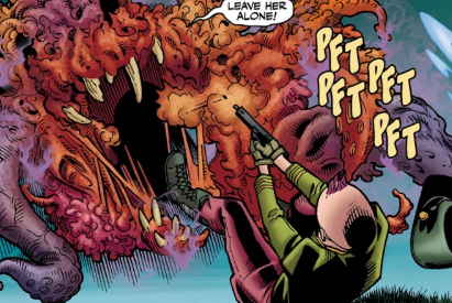 Simone is knocked over by the creature and pointlessly fires her gun at it, every shot wasted as it tries to pierce the demon’s hide. It pins her to the ground and opens what looks like it’s jaw.