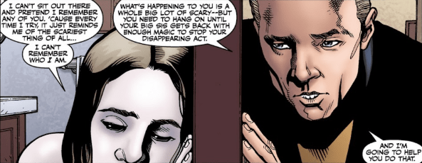 Dawn is leaning against the door, unable to move. She looks like she has no energy to get up. “Leave me alone. Please. I can’t sit out there and pretend I remember any of you. And every time I try it just reminds me of the scariest thing of all: I can’t remember who I am.”