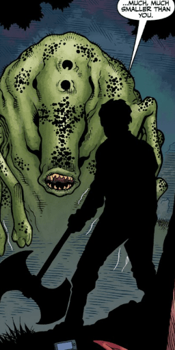 When he turns, Xander sees a large creature, a face like an anteater, although Xander can tell, from his green scales and his sharp teeth that it’s not one of those. “…pick on someone, much, much smaller than you…” He backs away from the demon, slowly as it approaches him. He picks up his axe.