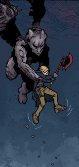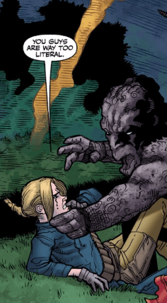 Suddenly, a thick, lumbering form comes from behind him, out of the foliage. “Hey, why don’t you pick on someone…”