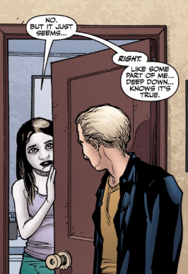 In another part of the apartment, Spike sits outside the bathroom door on the floor. The door has been locked from the inside by Dawn, who’s barricaded herself in. Spike, gently and not forcefully, taps on the door. “Open up, niblet.”