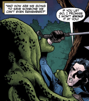 In the sky, Willow sees her friend in peril and shouts. As she powers up a blast, another mystical bolt of energy slams into Willow’s back, followed by the large green Zen woman. The large God declares that Willow is using power she shouldn’t have. Willow shakes her off and sarcastically informs her than people who are Zen don’t usually fight either.