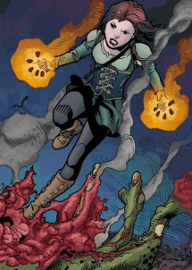 A projectile comes dropping from the sky and lands on the demon, squishing it flat, demon body parts squelching around them as she lands. She’s angry, her eyes are black and she’s handling living flame in her hands. Xander asks her if she’s okay.