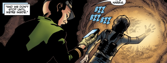 Xander turns when he hears Buffy’s voice. It’s confident and strong. Undeterred. “They’re not the only ones with reinforcements.” Eldre Koh and Illyria stand directly behind her, backing her up. “And we don’t stop until we get inside.”