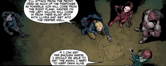 She directs Koh from the right, and Xander from the left. Willow and Illyria will go from the rear and Buffy will take them from the front. The goal is to gain entrance into the Well as quickly as they can and then escape with enough magic to cure Dawn.
