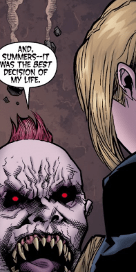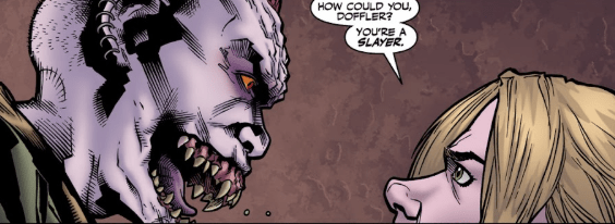 Buffy Summers is disgusted at the perversion of everything she believes in in front of her. Even pinned to the ground by the ‘Slaypire’, Buffy still fights back with the only weapon she currently has: her mouth. “How could you, Doffler? You were a Slayer.”