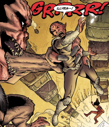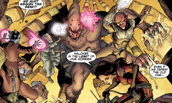At the battle for the Deeper Well, Maloker continues to cut the Council to pieces. The Wizard’s latest attempts to slow the bat-like Old One down have failed miserably, and Koh, still held in the monstrous demon’s claws, is finding his light blades less than successful in freeing him. Instead, he yells in the creature’s silent face. “I will slice you from the inside.”