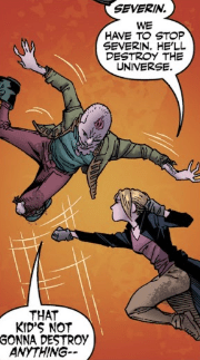 Buffy rushes her, telling her that she has her priorities wrong: Severin has to be stopped before he destroys the entire universe. Simone actually chuckles at her as she dodges Buffy’s strike. “That kid’s not gonna destroy anything other than himself and hopefully what’s left of the Council.”