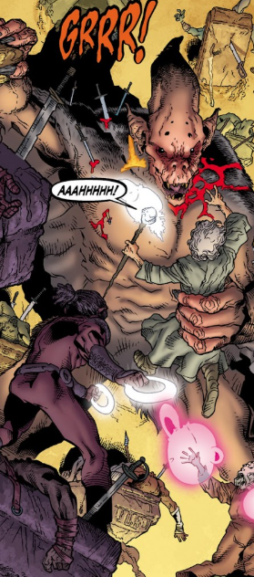 As Willow takes her leave and climbs her rope up from the platform, she spies Xander on a nearby ledge and yells his name. Looking up, she can now see Maloker, Koh leaping from his grasp and D’Hoffryn, the only Council member still alive, pointlessly throwing blasts at the Old One. He may as well be throwing sparkles.