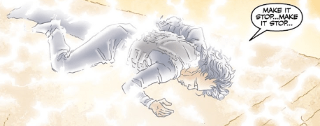 At the same time, still on the hovering glass platform, Severin, still in pain and fighting off a huge amount of magical energy cries out in an inhuman wail. He begs for help, weakly calling his girlfriend’s name, but the break in the pain is too short and, once again, he shouts into the abyss.