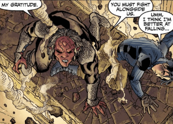 Koh and his projectile fall quite some way, but in the end, land with a crunch on a casket, projecting out from it’s crevice in the wall. He looks at the form whose fall he just broke. Xander Harris turns around, looks at Koh somewhat relieved and coughs.
