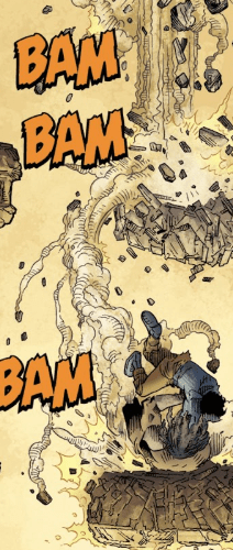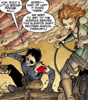 “Sorry. Kind of left it down there!” Although it’s a joke, her next words come out with intense concern. “We need to get to the surface before this elevator shaft becomes magical Chernobyl!”
