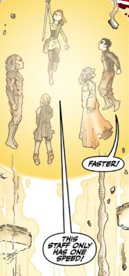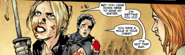 Buffy, rousing in Koh’s arms, looks up into his eyes. Her face is bruised and bloodied, but still she moves to rise. “It’s all my fault…” Eldre Koh shakes his head, his arm around her. “No. We all chose to be here.”