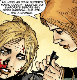 Willow ignores her, tells her not to be stupid. “Don’t be, Buffy. The new Seed’s going live any second.” She looks at the Slayer, holds her face with her hand, and makes sure their eyes lock. “As long as your sister’s magic doesn’t completely evaporate before Sev goes kaboom, she still has a chance.”